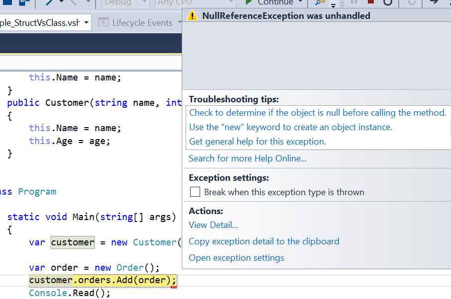 public class Order { } public class Customer { public string Name; public int Age; public List<Orders>; public Customer() { } public Customer(string name) { this.Name = name; } public Customer(string name, int age) { this.Name = name; this.Age = age; } } class Program { static void Main(string[] args) { var customer = new Customer(); var order = new Order(); customer.orders.Add(order); Console.Read(); } } - So we should initialize the list of order inside the constructor. But the problem is, when we use other parameter constructors , list will be set to null again. To overcome this, We can pass control from one constructor to the other by using the this keyword.
